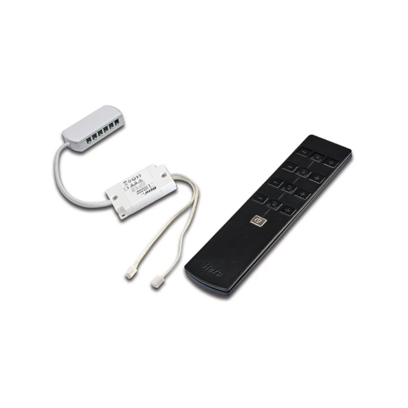 24V rádiový regulátor stmievania 80 W s 12-cestným rozdelovacom a 4-kanálovým rádiovým dialkovým ovládaním Zásuvný transformátor s rádiovým dialkovým ovládaním na stmievanie a spínanie s dosahom do 15 m je vybavený pamätovou funkciou, takže po odpojení od siete sa obnoví predchádzajúci stav stmievania.