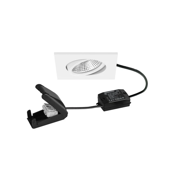 Zapustené LED bodové svietidlo BB25 IP65 s prepínateľným LED ovládačom a pripojovacou krabicou Uhlové zapustené LED bodové svietidlo BB25 s 15° otočným bodom možno vďaka stupňu krytia IP65 inštalovať v kúpeľniach, wellness priestoroch atď. Bodové svietidlo možno inštalovať do stropov s maximálnou hrúbkou 1,7 cm bez použitia náradia pomocou montážnych pružín. Dodáva sa pripravený na pripojenie s pripojovacou krabicou a vypínateľným LED ovládačom a nie je stmievateľný. Teplé biele svetlo vyžaruje pod uhlom 36° strieborný reflektor s rotačne symetrickým hlbokým širokopásmovým rozptylom svetla a optimálne sa distribuuje cez priehľadný plastový kryt.