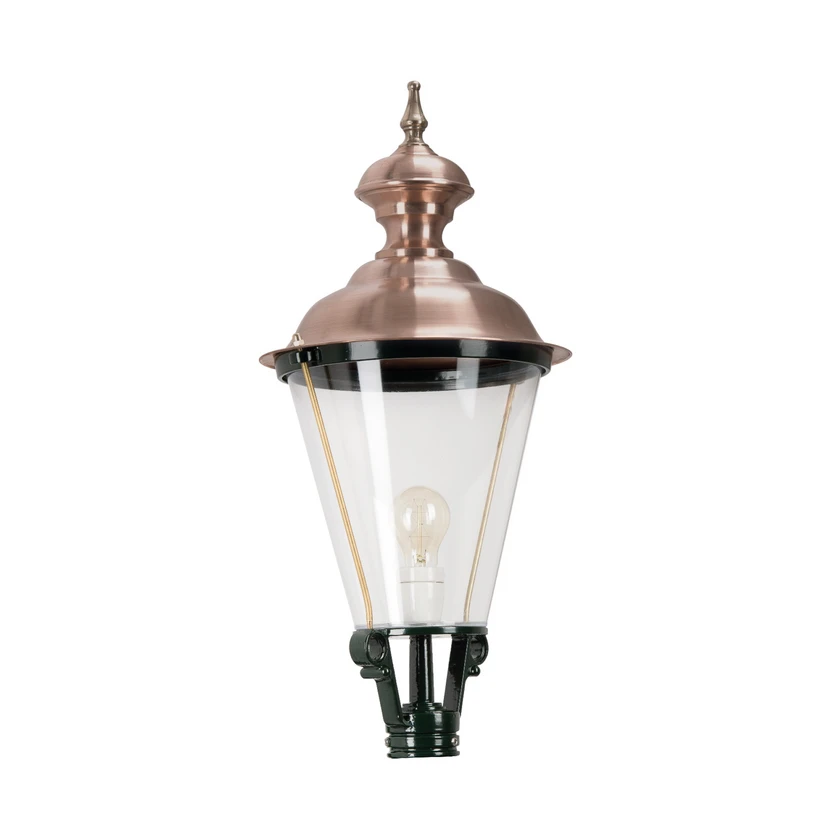 Užitočné cestné svetlo K43 s ozdobnou medenou kupolou Cestné svetlo K43 nielenže plní svoj účel, ale je aj dekoratívne na pohľad. Je to najmä vďaka dômyselne navrhnutej medenej kupole s atraktívnym svitom. Tá vytvára naozaj skvelý kontrast k pomerne tmavému kovu svietidla. Vďaka veľkým akrylovým plochám možno zabezpečiť dostatok svetla, takže vonkajší priestor je jasne osvetlený aj v noci. Základná doska nie je súčasťou dodávky a je potrebné ju zakúpiť samostatne. Na inštaláciu cestného svietidla K43 je potrebné zavolať aj odborníka na elektroniku.