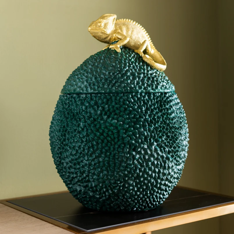 Ozdobná krabička Chameleón oválneho tvaru v tmavozelenej a zlatej farbe Ozdobné predmety, ako je táto ozdobná krabička Chameleón, sú ako šperky: Vhodne zvolený dekoratívny predmet veľmi uľahčuje vzrušujúce štýlové zlomy. Škatuľka je vyrobená z tmavozeleného umelého kameňa a na vrchnej strane ju zdobí chameleón v zlatej farbe. Ponúka úložný priestor na najrôznejšie drobnosti alebo šperky a vyzerá neuveriteľne dekoratívne na komode v predsieni, v spálni alebo na príborníku v obývačke.