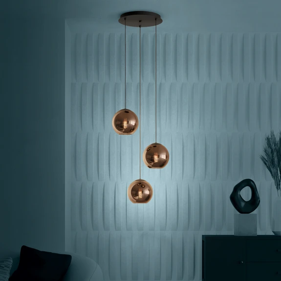 3-plameňové závesné svietidlo Cordoba spája minimalistický a moderný dizajn s kvalitnými materiálmi. Medené zafarbené parou guľaté sklenené tienidlá visia z okrúhleho baldachýnu z čiernej ocele a dodávajú miestnosti farebný akcent. Keď sú zapnuté, odhaľujú žiarovky, čo svietidlu dodáva osobitú eleganciu. Závesné svietidlo Cordoba nie je len optickým highlightom, ale ponúka aj možnosť individuálneho osvetlenia, pretože stmievateľné žiarovky je možné stmievať pomocou stmievača v inštalácii v miestnosti a prispôsobiť tak flexibilne každej nálade.
