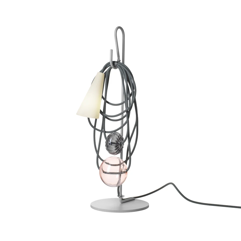 Dekoratívna stolová LED lampa Filo s neobyčajným dizajnomStolová LED lampa Filo je zložená z rôznych prvkov a materiálov a vďaka svojmu neobyčajnému dizajnu sa stane osobitným pútačom pozornosti v obytnom priestore. Rám stolnej lampy je vyrobený z kovu a slúži ako držiak kábla, ktorý je vybavený farebným textilným plášťom. Dekoratívne sklenené prvky sú fúkané ústami, boli formované a spracované ručne. Zaujímavú kompozíciu komponentov dotvára kužeľovité tienidlo, ktoré obklopuje svietidlo a bolo vyrobené z porcelánu. Stolná lampa sa zapína a vypína pomocou vypínača integrovaného v kábli.Filo je vhodná na použitie napríklad v obývacej izbe alebo na chodbe. Vďaka univerzálnym variantom dizajnu sa stolná lampa ľahko hodí do rôznych obytných prostredí. Teplé svetlo sa rozptyľuje cez biele tienidlo smerom k podlahe a vytvára útulnú atmosféru. Stolnú lampu navrhol taliansky dizajnér Andrea Anastasio. Jeho cieľom bolo vytvoriť scénu pre jednotlivé komponenty svietidla a zdôrazniť ich technické a estetické kvality. Chcel tiež dať väčší význam dekorácii začlenením sklenených prvkov, ktoré sa primárne nespájajú so svietidlami.