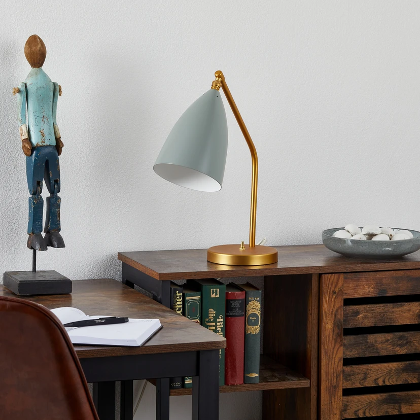 Dizajnová stolová lampa Gräshoppa - všestranný zdroj svetla so štýlom Príťažlivý kontrast medzi farebným práškovým tienidlom a mosadzným rámom stolovej lampy Gräshoppa je pôsobivý a moderný. Dizajn, ktorý vytvorila Švédka Greta Magnusson Grossman (1906 - 1999), pochádza z roku 1947. Dizajnérka, ktorá žila v Európe a Severnej Amerike a zamerala sa na priemyselný dizajn, bola považovaná za priekopníčku vo svete dizajnu, ktorému predtým dominovali muži. Jej návrhy lampy Gräshoppa a stolovej lampy Cobra sa považujú za ikony dizajnu. Kónické kovové tienidlo stolovej lampy Gräshoppa sa dá otáčať. To umožňuje meniť smer svetla podľa potreby. Vďaka svojmu dekoratívnemu dizajnu sa lampa Gräshoppa hodí k mnohým súčasným štýlom nábytku a môže sa používať na rôzne účely, napríklad ako lampa na čítanie na stole v obývačke alebo ako stolová lampa - Jednoduché ovládanie pomocou prepínača na podstavci lampy - Výrobok dánskeho výrobcu Gubi