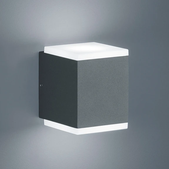Malé vonkajšie nástenné svetlo v tvare kocky LED Kibo je možné použiť ako vstupné osvetlenie vpravo a vľavo od predných dverí, ako zdroj svetla na terasu alebo na cesty okolo domu a zároveň na osvetlenie fasády. Grafitová prášková vrstva a hranatý dizajn z neho robia moderný a napriek tomu jednoduchý svetelný zdroj, ktorý dosahuje efektívny efekt iba pri zapnutí svetla. Potom svetlo svieti pozdĺž fasády nahor a nadol a vytvára jedinečné svetelné efekty, najmä keď je svietidlo zostavené v skupinách.