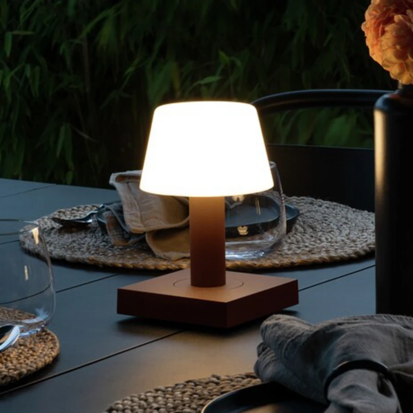 LED stolová lampa Monaco na vonkajšie použitie so skleneným tienidlom a štvorcovou základňouLED lampa na terasu Monaco je univerzálna, mobilná a atmosférická. Je navrhnutá v tvare malej stolovej lampy a pozostáva zo štvorcového farebného podstavca z hliníka a zrezaného kužeľovitého tienidla z opálového skla. Svetelný zdroj LED je integrovaný v tienidle a ovláda sa pomocou dotykovej ovládacej plochy na podstavci. Okrem spínania je možné aj stmievanie a prepínanie medzi dvoma teplými odtieňmi bielej. Vybavenie dobíjacou batériou a ochrana proti striekajúcej vode umožňujú použitie v mnohých prostrediach.- plynulé stmievanie- nastaviteľná farba svetla (2 700 K / 3 000 K)- vrátane nabíjacej stanice s káblom USB (na použitie v suchých interiéroch)- doba svietenia na jedno nabitie batérie: 9 h pri 100 % svetelnom výkone- stupeň ochrany: IP54