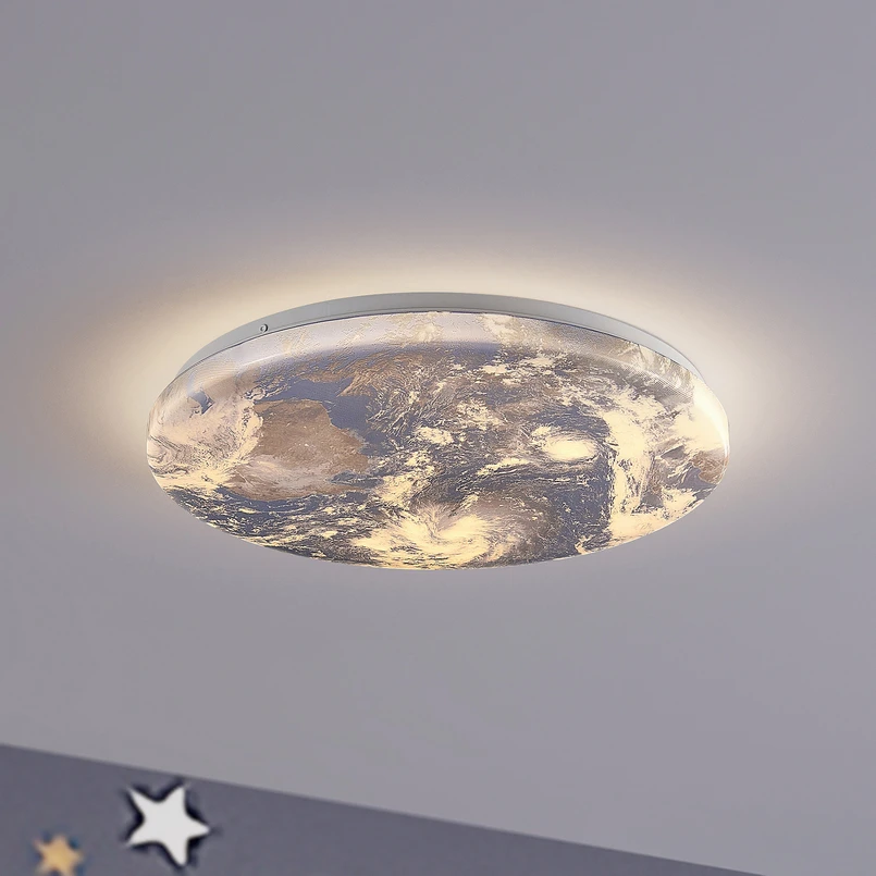 Špeciálne stropné svietidlo Gaios LED s plynulým stmievaním a funkciou CCT Stropné svietidlo Gaios LED zaujme zaujímavým vzhľadom, pretože jeho okrúhle a ploché tienidlo je potlačené obrázkom našej krásnej planéty Zem. Tento individuálny vzhľad okamžite upúta pozornosť na strope, vďaka čomu je na toto svietidlo radosť pozerať aj po vypnutí. Boduje aj svojimi technickými vlastnosťami, keďže pomocou dodaného diaľkového ovládania možno ovládať jas aj farbu svetla svietidla. Toto stropné svietidlo má tiež integrované nočné svetlo a pamäťovú funkciu, čo sa ukazuje ako mimoriadne praktické v každodennom živote.
