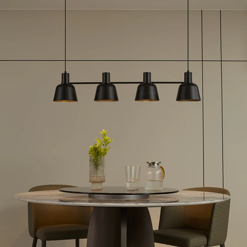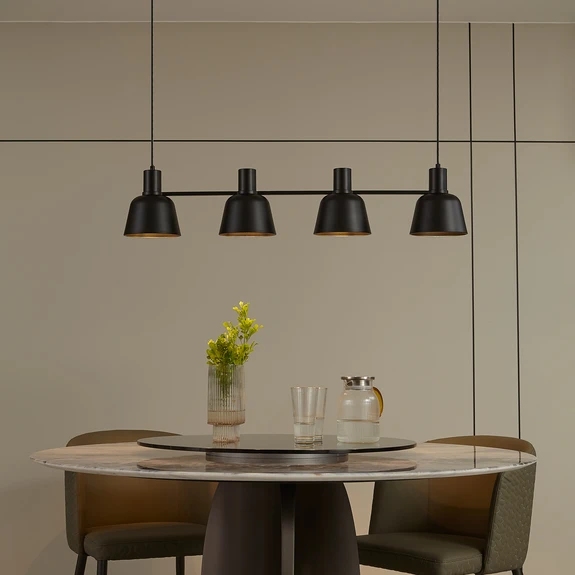 Štvorsvetelné dizajnové barové závesné svietidlo Servan s čiernymi kovovými tienidlami - odporúča sa na jedálenský stôl a pultServan je dekoratívny svetelný automat v modernom šate, ktorý sa dá vďaka svojmu jasnému dizajnovému jazyku dobre integrovať aj do škandinávskych štýlov. Dizajnové tienidlá sú vyrobené zo železa a sú lakované matnou čiernou farbou, čo im dodáva výrazný a štýlový vzhľad. Svetlo môže unikať len smerom nadol, čím sa dosiahne vycentrované osvetlenie povrchu stola alebo pultu, zatiaľ čo zvyšok miestnosti sa kúpe v príjemnom neoslňujúcom svetle. Exkluzívny dizajn závesného svietidla Beam je symbolom individualizmu a štýlového vzhľadu.