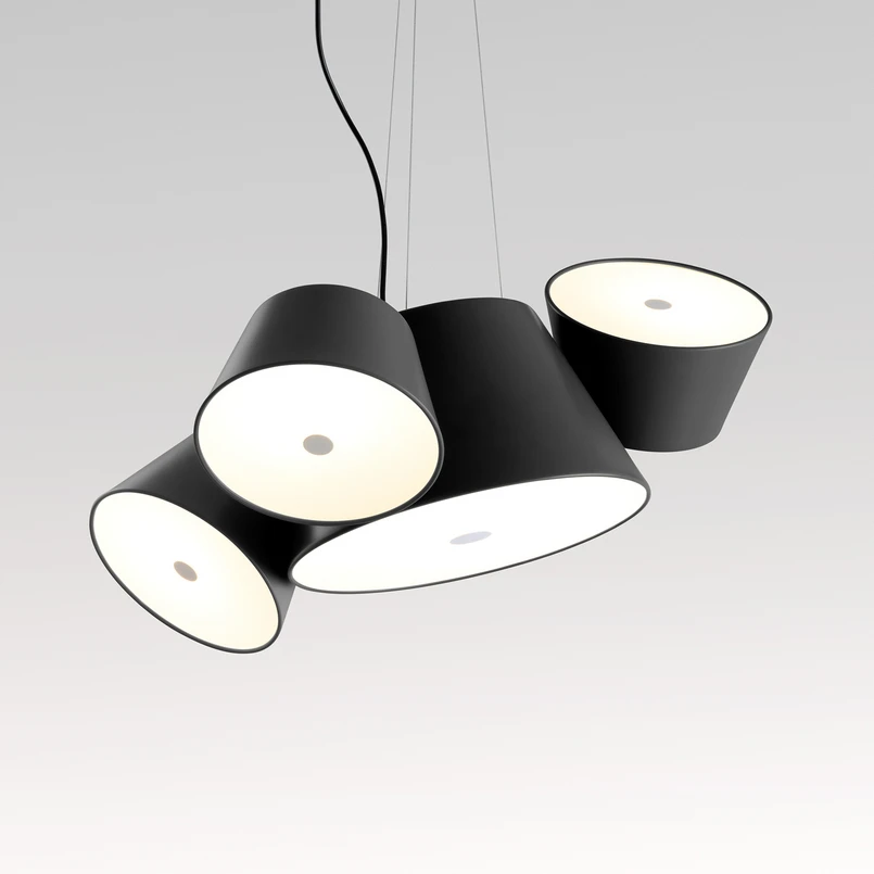 Matná povrchová úprava: Závesné svietidlo Tam Tam Mini s centrálnym tienidlom a tromi pohyblivými satelitmi, bez oslneniaDizajn moderného závesného svietidla Tam Tam Mini pochádza z pera dizajnéra Fabiena Dumasa, ktorý ním chcel vytvoriť pocit organizovaného chaosu. V strede sa nachádza veľké tienidlo, ktoré svieti pevne smerom nadol. Z vonkajšej strany sú pripevnené tri menšie tienidlá, ktoré sa dajú otáčať, a tak nastaviť podľa potreby. Vo veľkom tienidle sú umiestnené dve žiarovky E27 a v malých satelitoch je umiestnená každá žiarovka E27 (pozri príslušenstvo). Svetelnú náladu tak možno ovplyvniť výberom vhodného svetelného zdroja a v prípade potreby možno tienidlá osadiť rôznymi žiarovkami. Všetky tienidlá sú vybavené opálovým bielym difúzorom, ktorý zabezpečuje homogénne a neoslňujúce vyžarovanie svetla. Tam Tam Mini sa opiera o tri laná, ktoré sa na strope končia kruhovým a plochým vrchlíkom. Toto estetické závesné svietidlo presvedčí ako moderný dizajnový prvok v interiéri, aj keď je svetlo vypnuté. Tam Tam Mini vyrába španielsky výrobca Marset, ktorý je známy inovatívnym dizajnom a vysokou kvalitou.