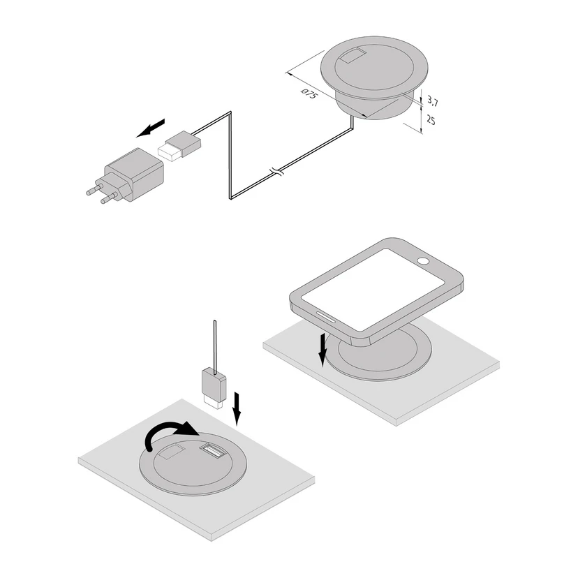 Táto zásuvka s čiernym okrúhlym plastovým rámom je určená na inštaláciu do nábytku a obkladov. Je vybavený výstupom USB na prevádzku a nabíjanie zariadení s napájacím napätím 5 V. Má tiež nabíjaciu plochu Qi na rýchle a bezdrôtové nabíjanie zariadení, ktoré túto pokročilú technológiu zvládajú.