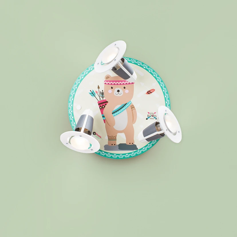 Nástenná lampa Malí indiáni je kruhový kruh s pekným zvieracím motívom, ktorý musí byť vybavený tromi svetelnými zdrojmi. Motív zobrazuje medveďa Bjørna v indickom vzhľade a očarí každý strop alebo stenu v detskej izbe.