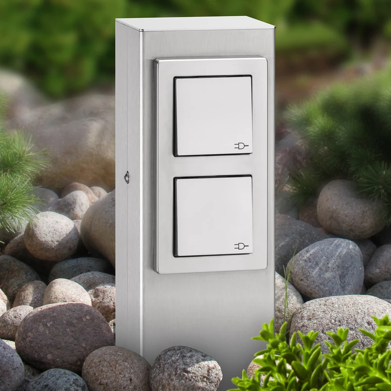 Tento praktický stojan na zásuvky je vyrobený z vysoko kvalitnej nehrdzavejúcej ocele. Odklápacie kryty chránia zásuvky pred všetkými vplyvmi počasia. Stojan má navyše vnútornú pätku na upevnenie do podlahy a je vedený až k vnútornej prípojnej skrini.