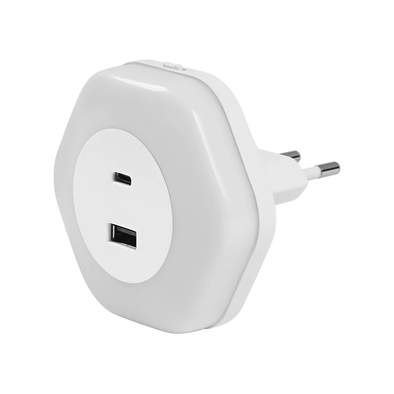 Praktické LED nocne svetlo do zásuvky LUNETTA HEXAGON s nabíjacími portmi Napájacie napätie: 30 V sieťové napätie. Integrovaný senzor denného/nočného svetla. Výhody produktu: Plug-and-Play vďaka EU zástrčke. Energeticky úsporné vďaka LED technológii. Charakteristický elegantný dizajn. Oblasti použitia: Spálňa. Detská izba. Chodby, schodiská. Nočné svetlo. Iba pre vnútorné osvetlenie.