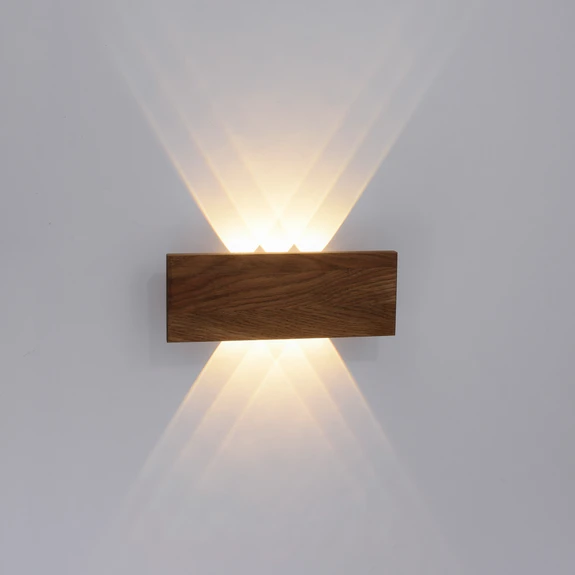 Nástenné svietidlo Palma LED s dekorom dreva, šírenie svetla smerom nahor a nadol Obdĺžnikové nástenné svietidlo Palma LED je vybavené teplými bielymi LED diódami za krytom z dosky MDF s krásnym dekorom dreva, ktorého svetlo vyžaruje smerom nahor a nadol, takže nástenné svietidlo vyčaruje na stene dekoratívny svetelný efekt s niekoľkými malými svetelnými kužeľmi smerom nahor a nadol a nepriamo osvetľuje miestnosť.