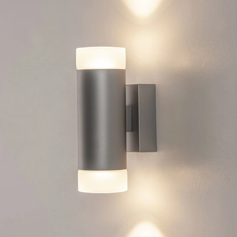 Nástenné svietidlo Astina s obojstranným vyžarovaním svetla Nástenné svietidlo Astina sa vyznačuje jasným a zároveň moderným dizajnom. Valcovité telo svietidla je vyrobené z hliníka a pokryté finálnym farebným lakom. Svetlo produkujú dve žiarovky GU10 vo vnútri telesa (pozri príslušenstvo) a vyžaruje sa cez dva otvory v hornej a dolnej časti. Dve satinované sklenené tienidlá zabezpečujú mimoriadne príjemný svetelný obraz. Ideálne na bezpečné osvetlenie chodieb alebo schodísk.