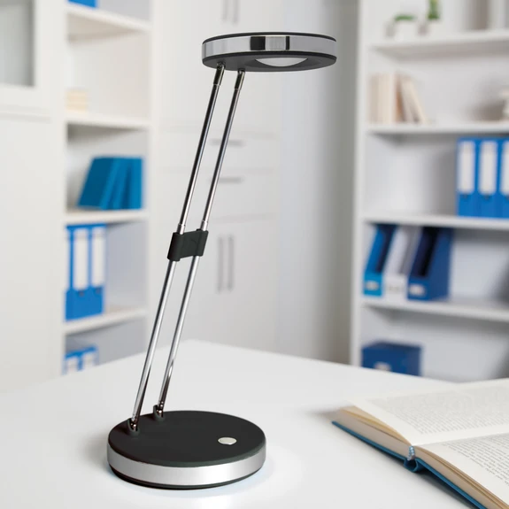 Stolná LED lampa MAULpuck s pohodlným dvojitým teleskopickým ramenom MAULpuck je veľmi praktický, priestorovo úsporný a energeticky efektívny zdroj svetla, ktorý možno použiť na optimalizáciu svetelných podmienok, napríklad na pracovnom stole, podľa individuálnych požiadaviek. Dvojité teleskopické rameno sa dá vysunúť z 18,5 cm na maximálne 33 cm a hlavu a rameno stolnej lampy možno otáčať. Vďaka tomu je možné veľmi jednoducho nastaviť smer svetla podľa potreby. Vďaka svojmu praktickému dizajnu zaberá MAULpuck veľmi málo miesta. Dá sa tiež zložiť, aby sa dala ľahko prenášať v aktovke alebo uložiť do zásuvky. Integrovaný difúzor zabezpečuje, že lampa vrhá len málo tieňa. Stolná LED lampa MAULpuck je stabilná vďaka záťažovej vložke v základni, ktorá je vybavená aj podložkou na ochranu stola - Vypínač zabudovaný v základni lampy