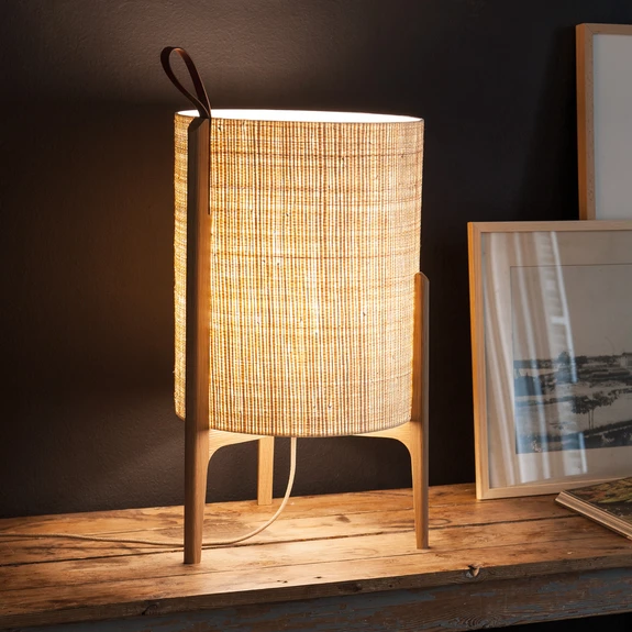 Stolová lampa Greta s valcovým tienidlom z palmového vlákna a dreveným rámomPrirodzenosť a teplé, pokojné farby sú hlavnými prioritami stolovej lampy Greta od španielskeho priemyselného a produktového dizajnéra Gabriela Teixidóa. Stolná lampa je ideálnym doplnkovým zdrojom svetla do interiéru vidieckeho domu alebo na vytvorenie prírodného akcentu v moderných a škandinávskych interiéroch.krátky rám trojnožky je vyrobený z dubového dreva, ktoré poteší svojou prirodzenou štruktúrou. K nemu je pripevnené tienidlo, ktoré má podobu vertikálne otvoreného valca. Tvorí ho prírodná béžová textília tkaná z palmových vlákien. Hnedá kožená slučka nabáda k tomu, aby sa z času na čas menila poloha svietidla Greta. Stolná lampa je vybavená káblom so zástrčkou a vypínačom.