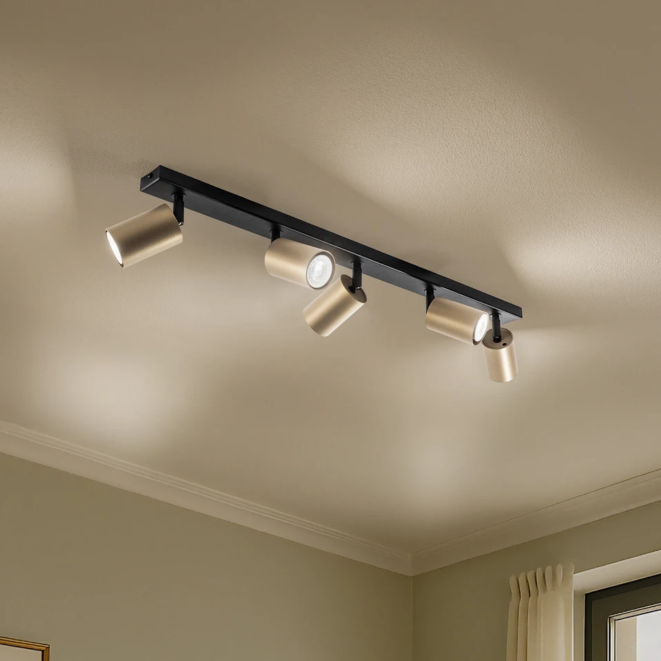 Stropné bodové svetlá Zoom, 5-pl., v čiernej a zlatej farbe, spájajú moderný dizajn s funkčnou univerzálnosťou. Vyrobené z vysoko kvalitnej ocele, tieto bodové svetlá sa bezproblémovo začlenia do rôznych priestorových konceptov, či už v obývacej izbe, predsieni, kuchyni alebo jedálni. Kombinácia čiernej a zlatej povrchovej úpravy dodáva miestnosti elegantnú a zároveň modernú atmosféru.