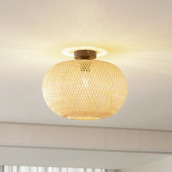 Stropné svietidlo Kessia: tkaný bambus pre prirodzenú eleganciu Objavte hrejivé vyžarovanie stropného svietidla Kessia, ktoré vďaka svojmu priemeru 40 cm a prírodnému sfarbeniu bambusovej tkaniny vnesie do vašich izieb útulnú atmosféru. Svetlo, ktoré je vhodné najmä do jedálne, obývačky alebo predsiene, odráža svojím rustikálnym šarmom štýl vidieckeho domu a harmonicky sa začlení do zodpovedajúceho interiéru. Ak je stropné svietidlo Kessia vybavené stmievateľnými svetelnými zdrojmi (nie sú súčasťou dodávky), možno vytvoriť flexibilné osvetlenie.