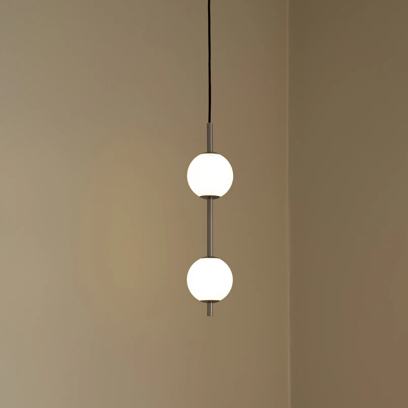 LED závesné svietidlo Audrey v oceľovom vyhotovení s dvoma guľami z opálového skla, ktoré svietia dookola