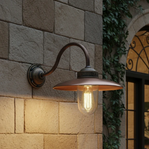 Elegantné vonkajšie nástenné svietidlo Landes s medeno-mosadzným rámom Vonkajšie nástenné svietidlo Landes je mimoriadne pôsobivé vďaka použitiu vysokokvalitných materiálov, ktoré ponúkajú nielen vysokú kvalitu, ale aj atraktívny vzhľad. Elegantný nástenný držiak je obzvlášť pôsobivý svojím zaobleným tvarom a veľmi plochým a širokým tienidlom. To obzvlášť dobre ladí so sklom svietidla, keďže tvary sú čiastočne podobné, a preto prechod pôsobí veľmi elegantne a plynulo.