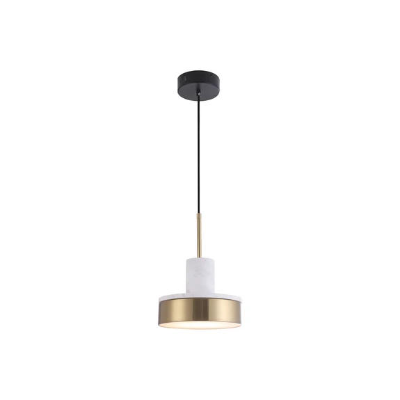 Závesné svietidlo Lithos LED s mramorovým závesom Závesné svietidlo Lithos LED je absolútne pútavé vďaka výberu materiálov a kontrastným farbám: tienidlo je vyrobené z lakovanej ocele zlatej farby a záves je z kontrastného farebného mramoru. Lithos je ideálnou voľbou pre každého, kto hľadá energeticky úsporné riešenie osvetlenia. Vďaka integrovanému svetelnému zdroju LED poskytuje príjemné a jasné svetlo, ktoré premení každú miestnosť na inšpiratívnu atmosféru. Či už v obývačke, jedálni alebo kuchyni - Lithos je všestranný a dokonale sa prispôsobí akémukoľvek štýlu interiéru.